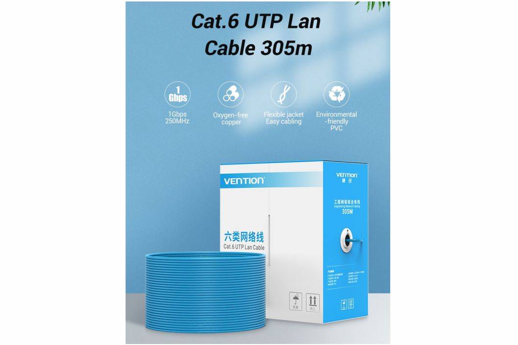 Specifications :🔹 Color Cat.6 : Blue🔹 Length : 305M🔹 Connector : RJ45 8P8C, Gold Plated Contact Pins, HQ PVC Molded Boots🔹 Host Standard : 250MHz🔹 Conductor Material : 24AWG, 99.99% Oxygen-free Copper (Cat.6)🔹 Wire Structure : Core frame , Twisted Pair (Cat.6)🔹 Shield : UTP, Gold-plated Phosphor Bronze🔹 Insulator : High-Density Polyethylene HDPE🔹 Jacket Shell : PVC Environmental MaterialGaransi Resmi 2 Tahun diluar human error