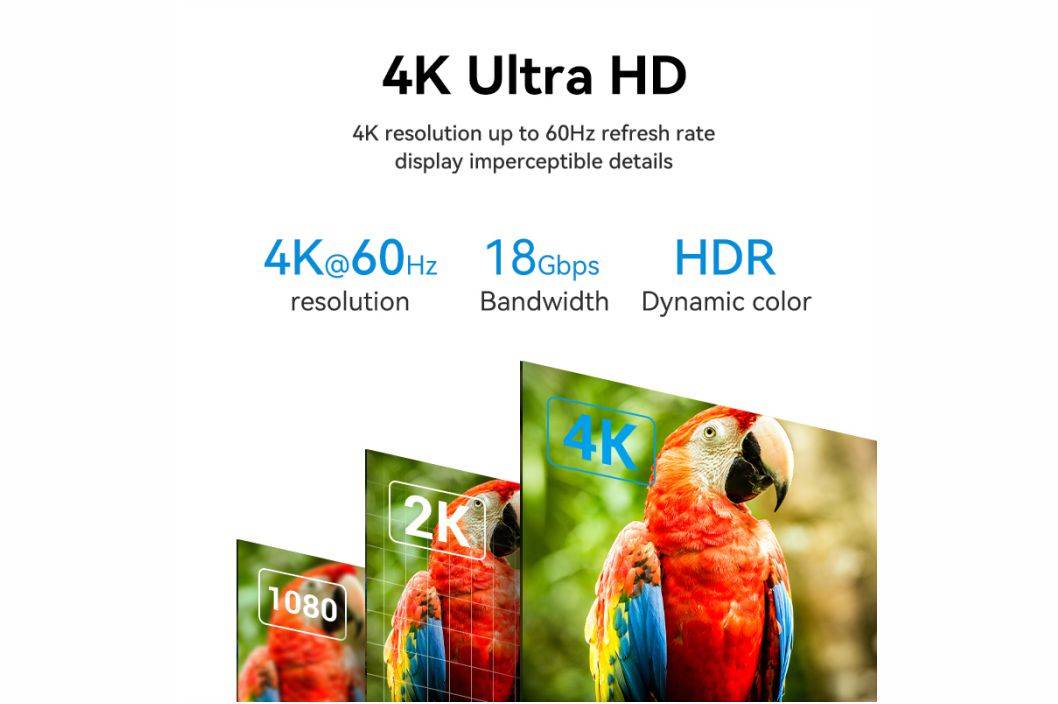 FEATURES:🔹Sync Audio & Video🔹High Speed 18Gbps🔹Ethernet & 3D Support🔹No splash (Transmission stability)🔹Resolution : 4K@60hz (0.5m-3m), 4K@30Hz (5-15m)