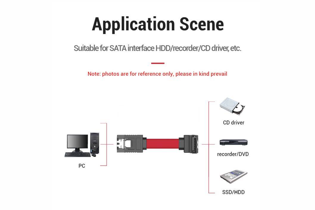 Features : 🔹 High speed transmission rate up to 6Gbps 🔹 Backward compatible with SATA 1.0/2.0 🔹 Double Clips Design 🔹 Right Angle Interface 🔹 Flexible flat cable 🔹 Suitable for SATA interface HDD/Recorder/CD Driver, etc