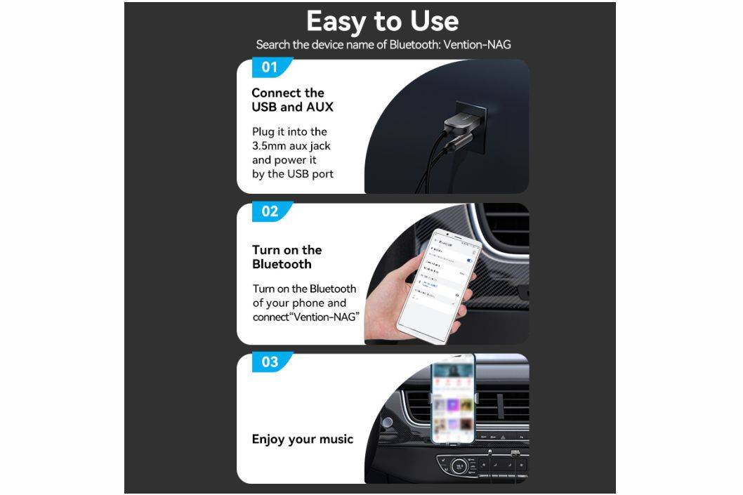 Specifications : 🔹 Bluetooth Version : 5.0 🔹 Distance : up to 10M 🔹 Device Name : Vention-NAG 🔹 Length : 1.5M 🔹 Connector Interface : USB 2.0 A Male to 3.5mm TRS Male 🔹 Connector Material : Nickel-plated 🔹 Shell : Zinc Alloy(USB-A)+Copper(TRS 3.5mm) 🔹 Conductor : Enamelled Copper 🔹 Jacket : PU