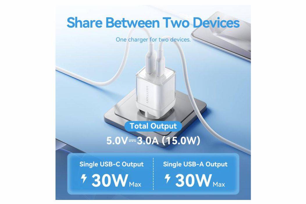 SPECIFICATIONS : 🔹Brand : Vention 🔹Product : 30W GaN Charger 🔹Color : Gray/Pink/White 🔹Material : PC 🔹Interface : USB-A/USB-C 🔹Input : 100-240V~50Hz/60Hz 1.0A Max 🔹Output USB-A : 5V=3A; 9V=3A; 12V=2.5A;20V=1.5A 30.0W Max 🔹Output USB-C : 5V-3A; 9V-3A; 12V-2.5A; 15V-2A;20V-1.5A 30.0W Max 🔹Output USB-A+USB-C : 5V-3A 15.0W Max 🔹Total Output : 30W 🔹USB-C Protocols : PD 3.0/PPS/ QC 3.0/ FCP/ AFC/ Apple 2.4 🔹USB-A Protocols : QC 3.0/ FCP/ AFC/ Apple 2.4