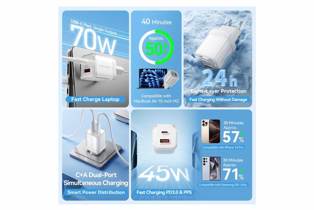 SPECIFICATIONS : 🔹Brand : Vention 🔹Product : 70W GaN Charger 🔹Color : Gray/Pink/White 🔹Material : PC 🔹Interface : USB-A/USB-C 🔹Input : 110-240V~50Hz/60Hz 1.8A Max 🔹Output USB-A : 5V=3A; 9V=2A; 10V=2.25A;12V=1.5A 22.5W Max 🔹Output USB-C : 5V-3A; 9V-3A; 10V-2A; 12V-3A;15V=3A; 20V=3.5A 70.0W Max 🔹PPS : 3.3~11V-5A 55W Max 🔹PPS2 : 3.3~21V=3A 63W Max 🔹Output USB-A+USB-C : 15.0W+45.0W